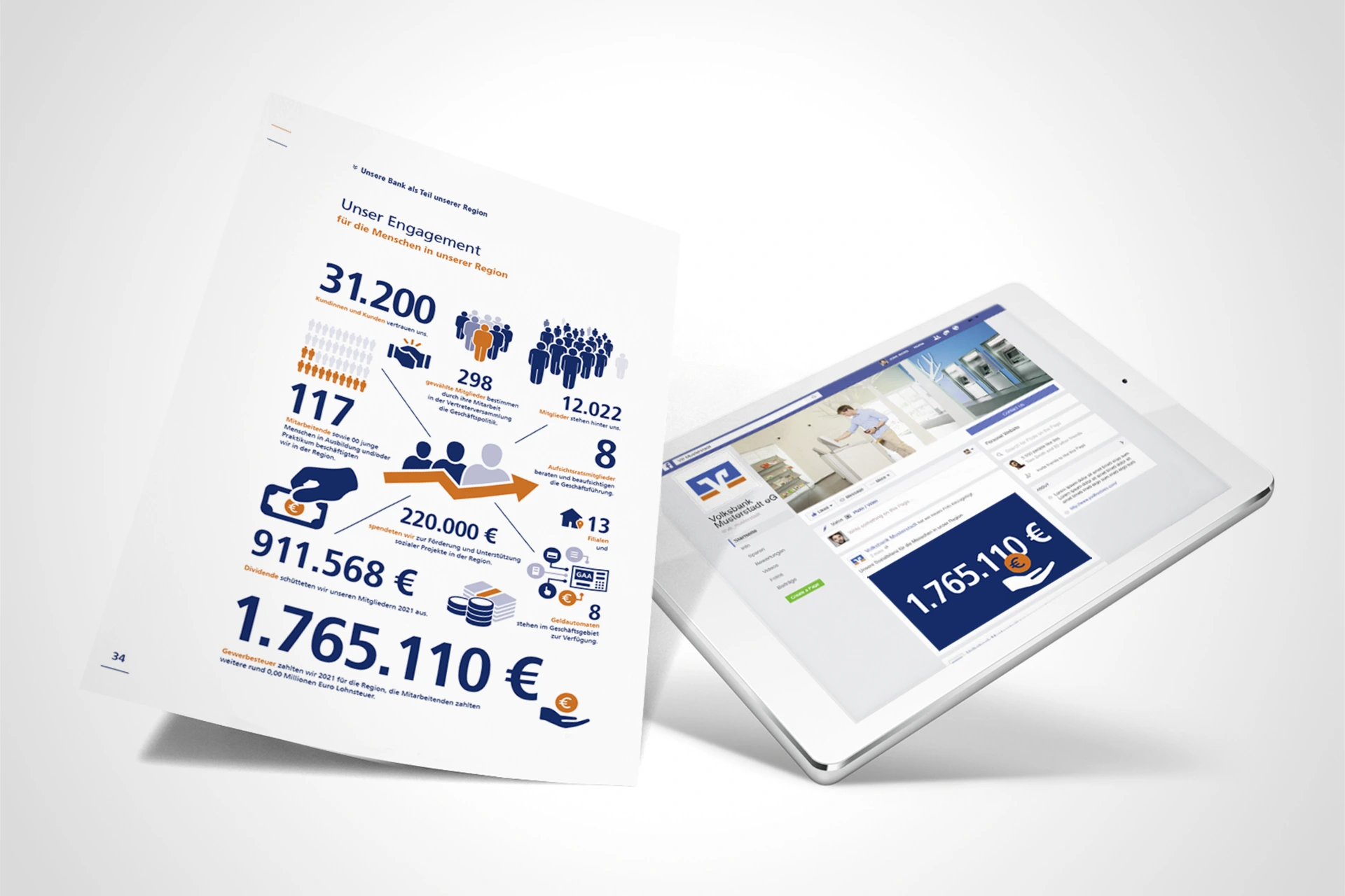 Eine ganz besondere Seite zeigt: Unsere Bank in der Region – mit Ihren Zahlen und Werten in Form einer Infografik für maximale Lesefreundlichkeit und Transparenz.